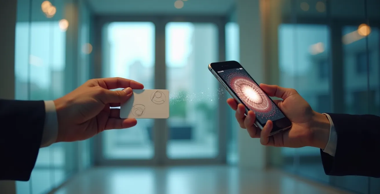 L’idée d’utiliser son smartphone comme badge d’accès est séduisante, mais soulève une question légitime : est-ce aussi sécurisé qu’un badge physique ? La réponse est oui, et souvent même plus, à condition que la technologie sous-jacente soit robuste. Les solutions de badge dématérialisé professionnelles ne se contentent pas d’imiter un badge ; elles utilisent des protocoles de communication sécurisés comme le Bluetooth Low Energy (BLE) et le NFC (Near Field Communication), couplés à un chiffrement fort.