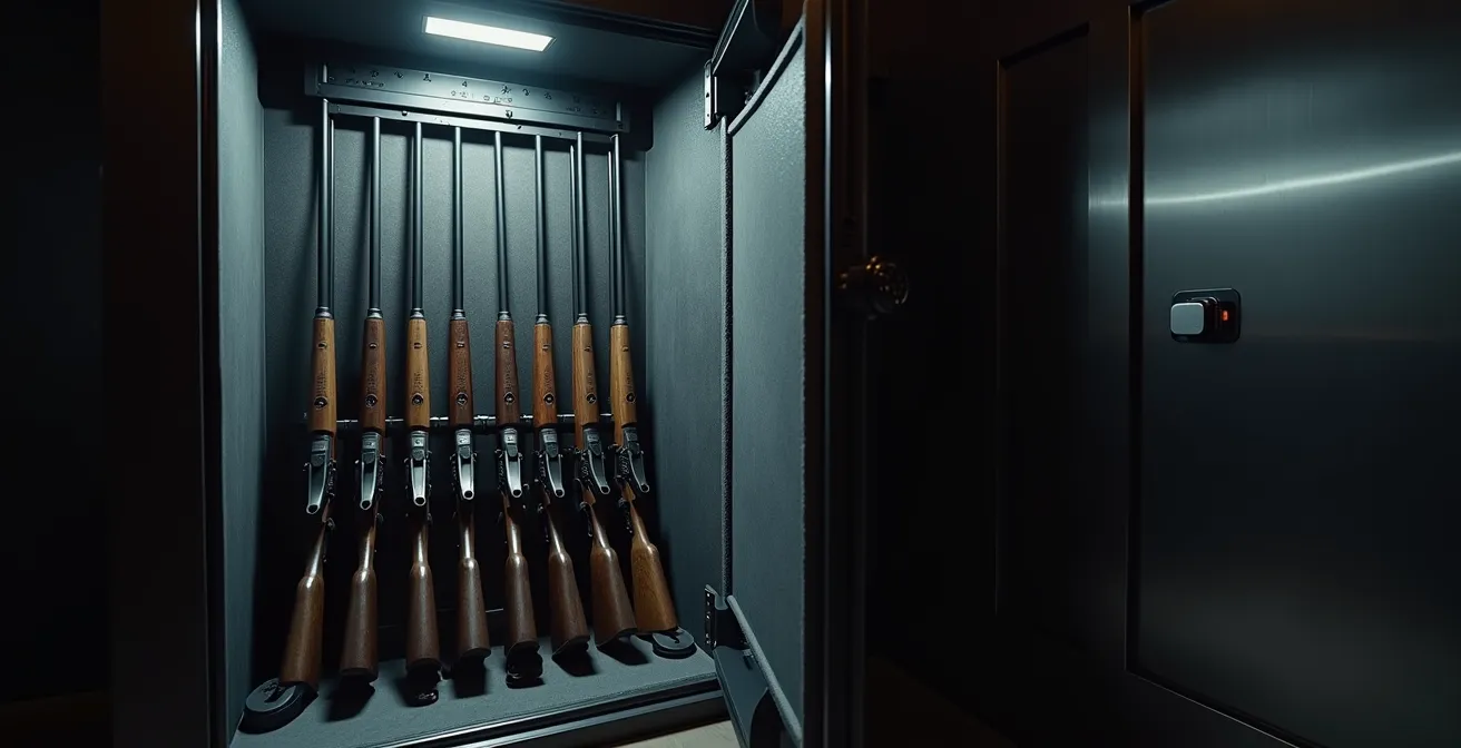 Pour tout détenteur légal d’une arme de catégorie C, qu’il soit chasseur ou tireur sportif, la question du stockage n’est pas une option, mais une obligation stricte. Cependant, beaucoup pensent que l’achat d’une armoire forte suffit à être en règle. Cette vision est non seulement incomplète, mais aussi dangereuse. La législation française, notamment le Code de la Sécurité Intérieure (CSI), est précise, mais son application sur le terrain par les forces de l’ordre lors d’un contrôle préfectoral répond à une logique pratique qu’il est impératif de comprendre.